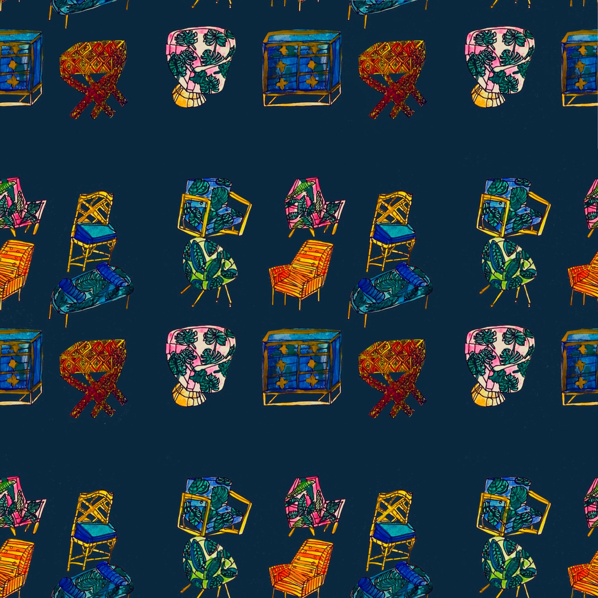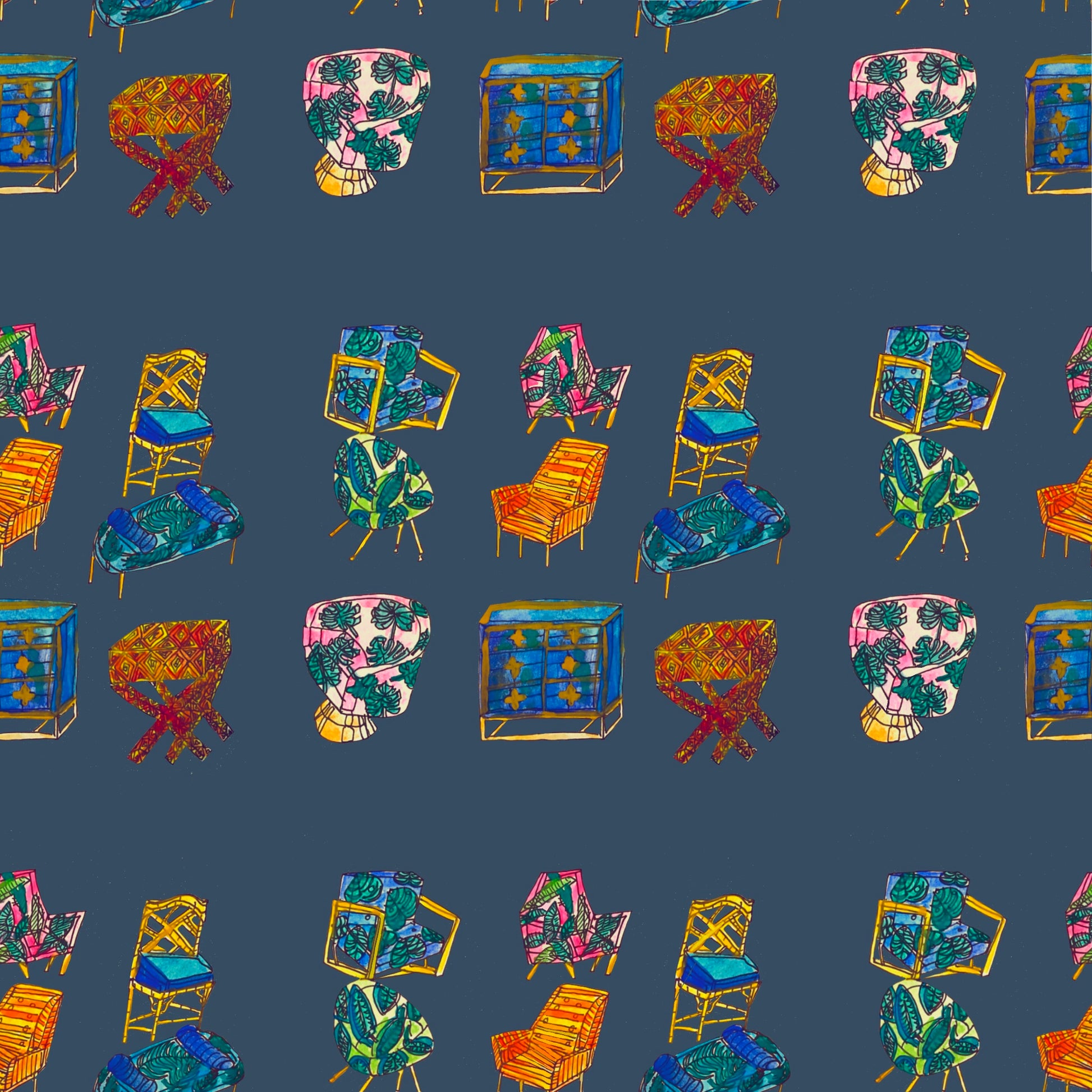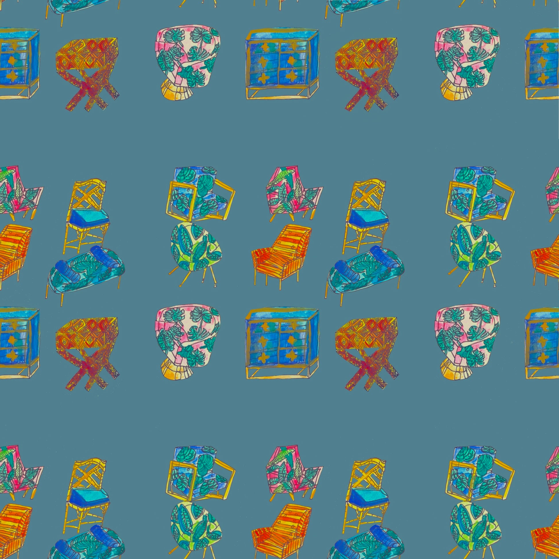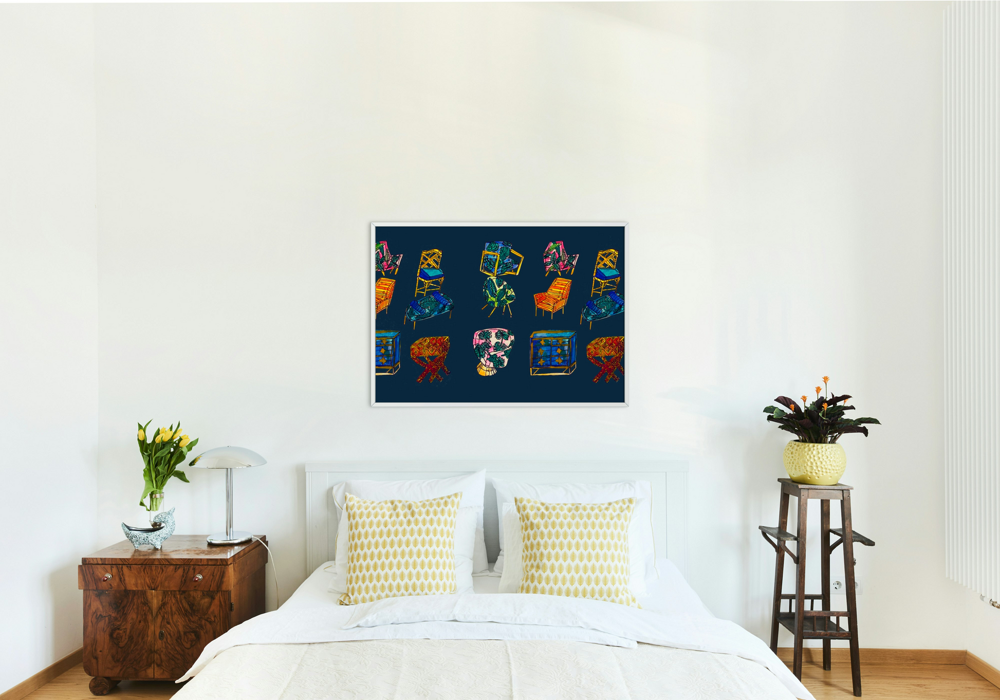 Hand-drawn artwork that celebrates the timeless allure of Mid-Century Modern (MCM) furniture, but with a contemporary and colorful twist.