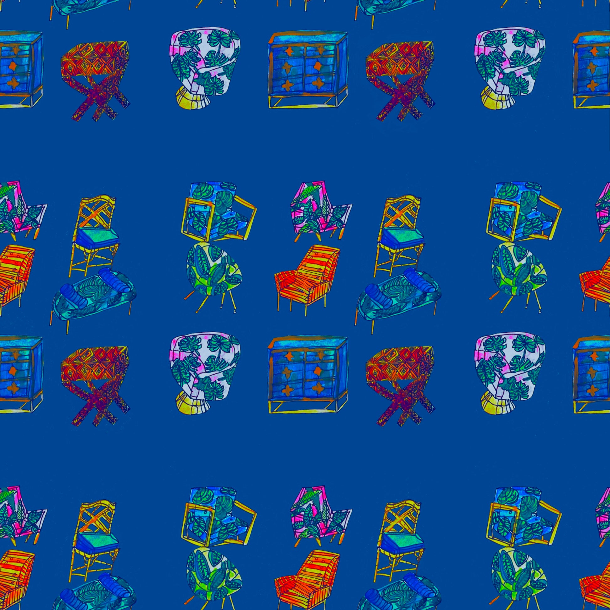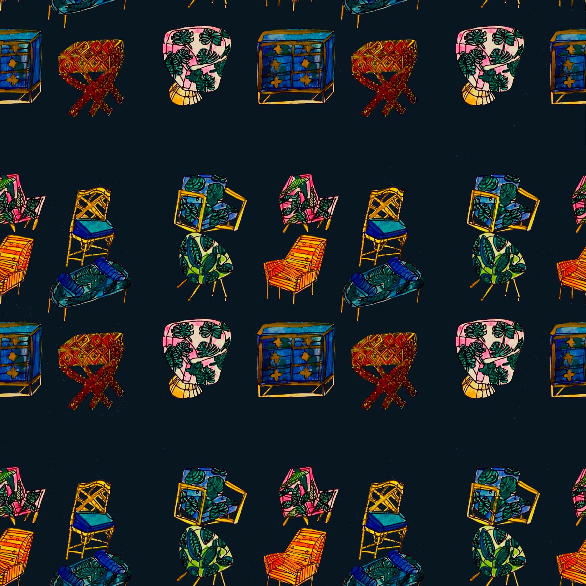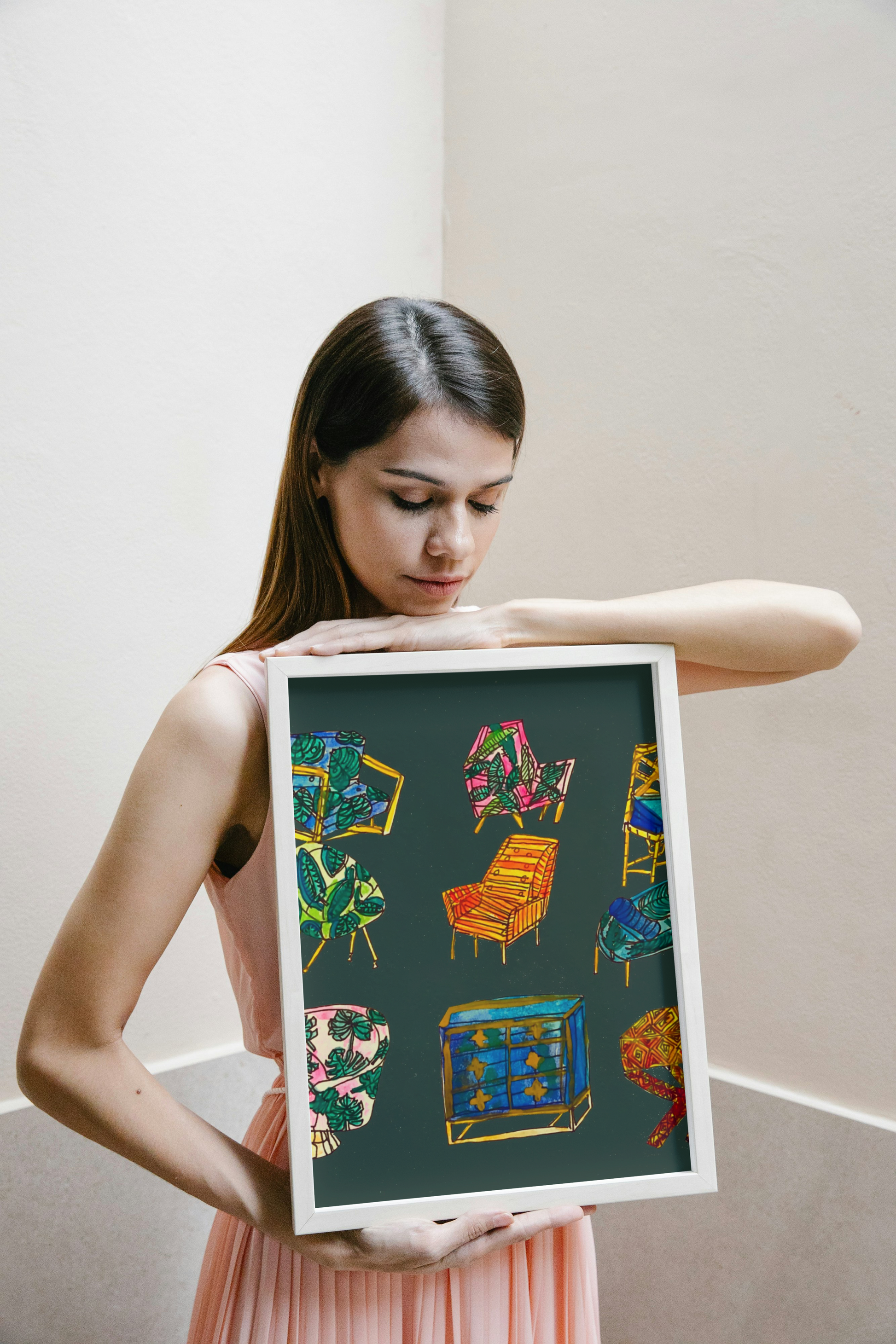 Hand-drawn artwork that celebrates the timeless allure of Mid-Century Modern (MCM) furniture, but with a contemporary and colorful twist.