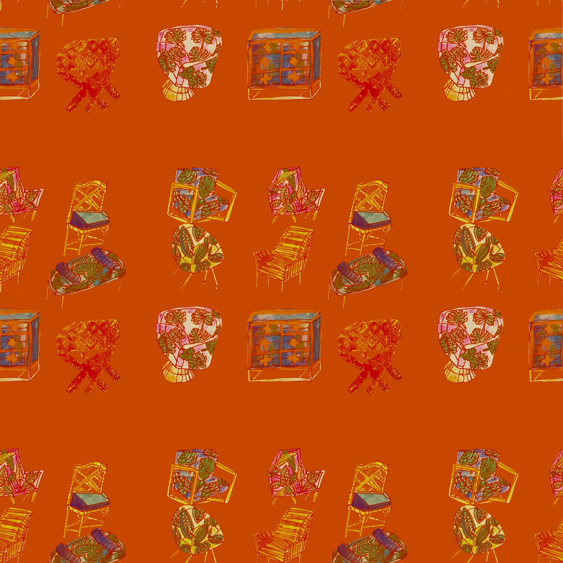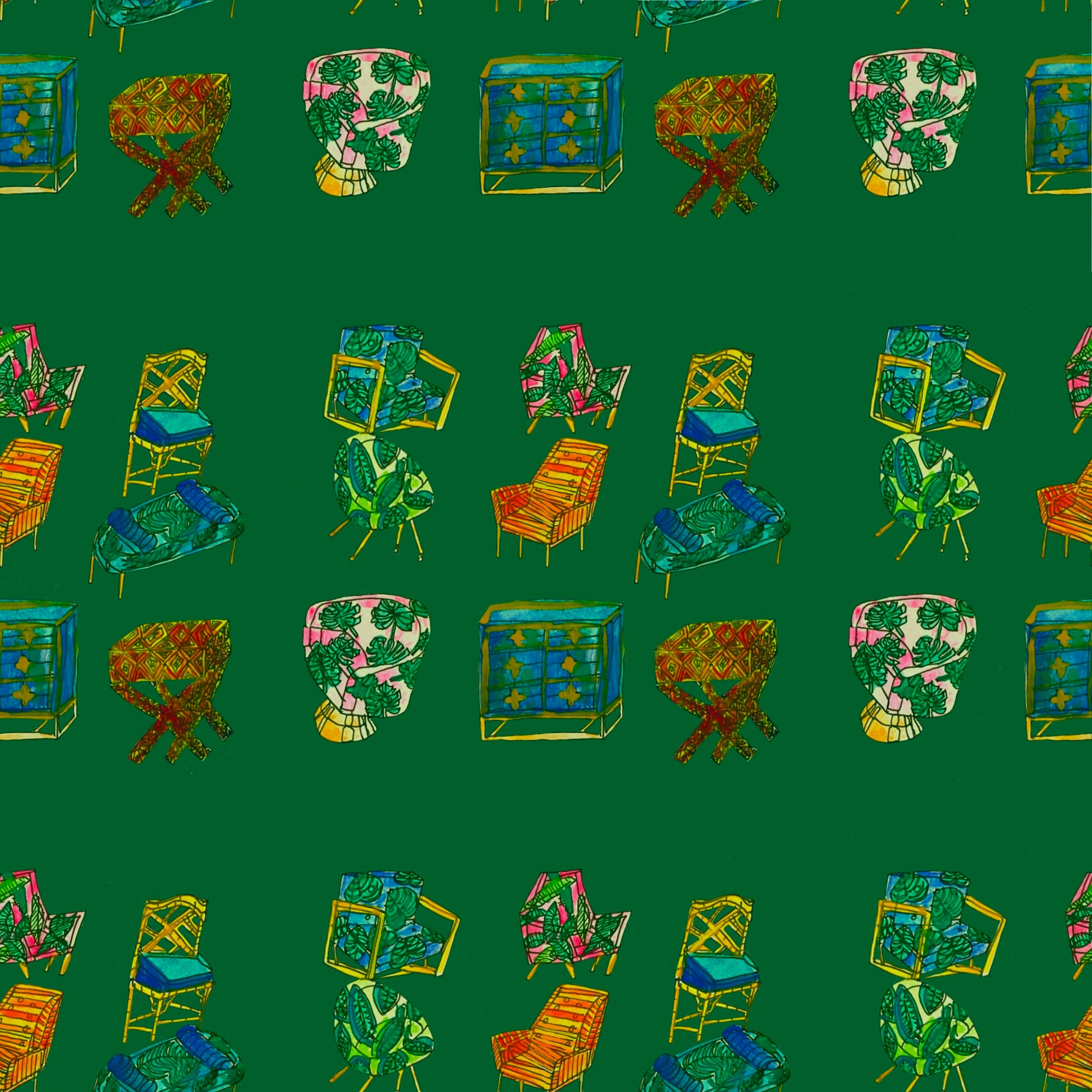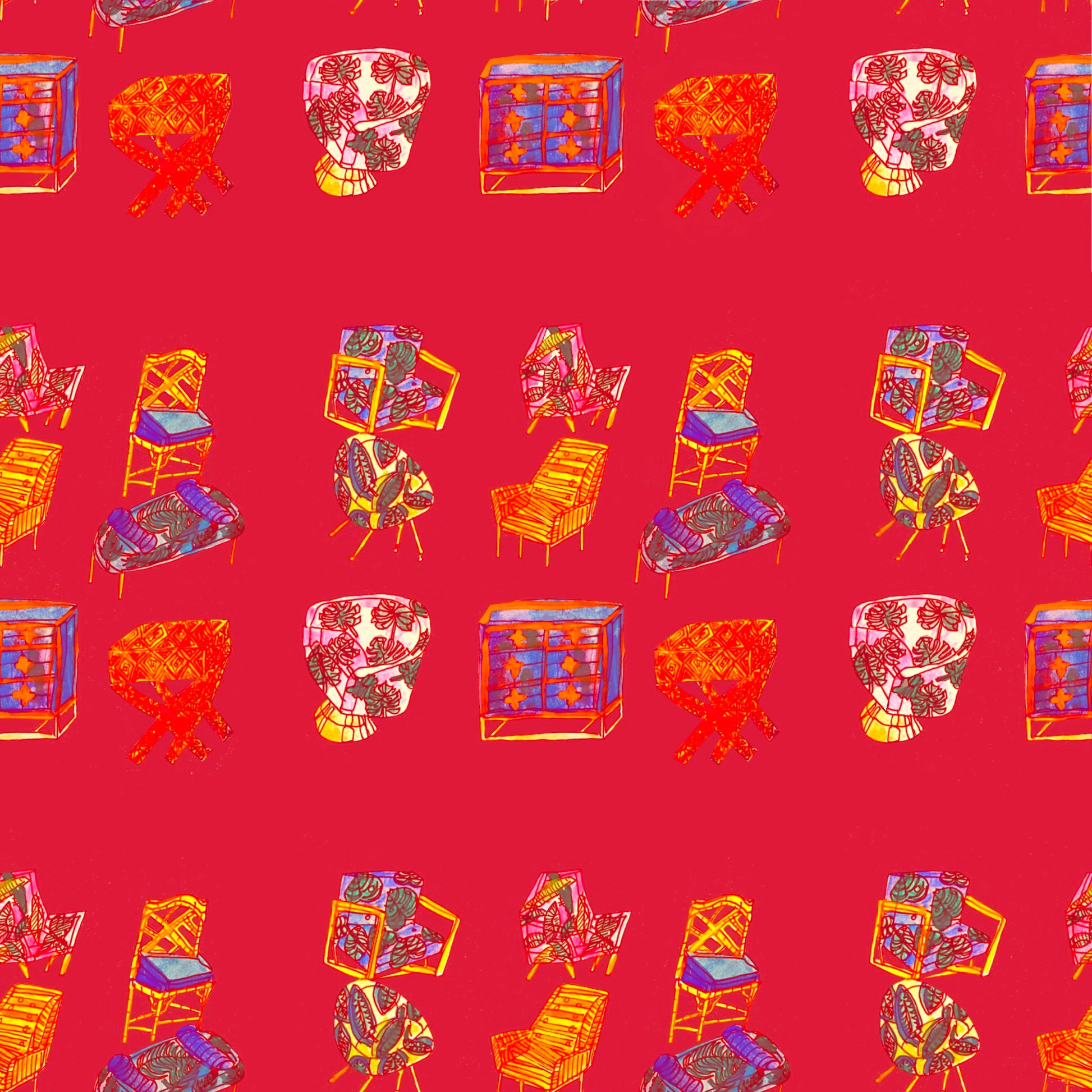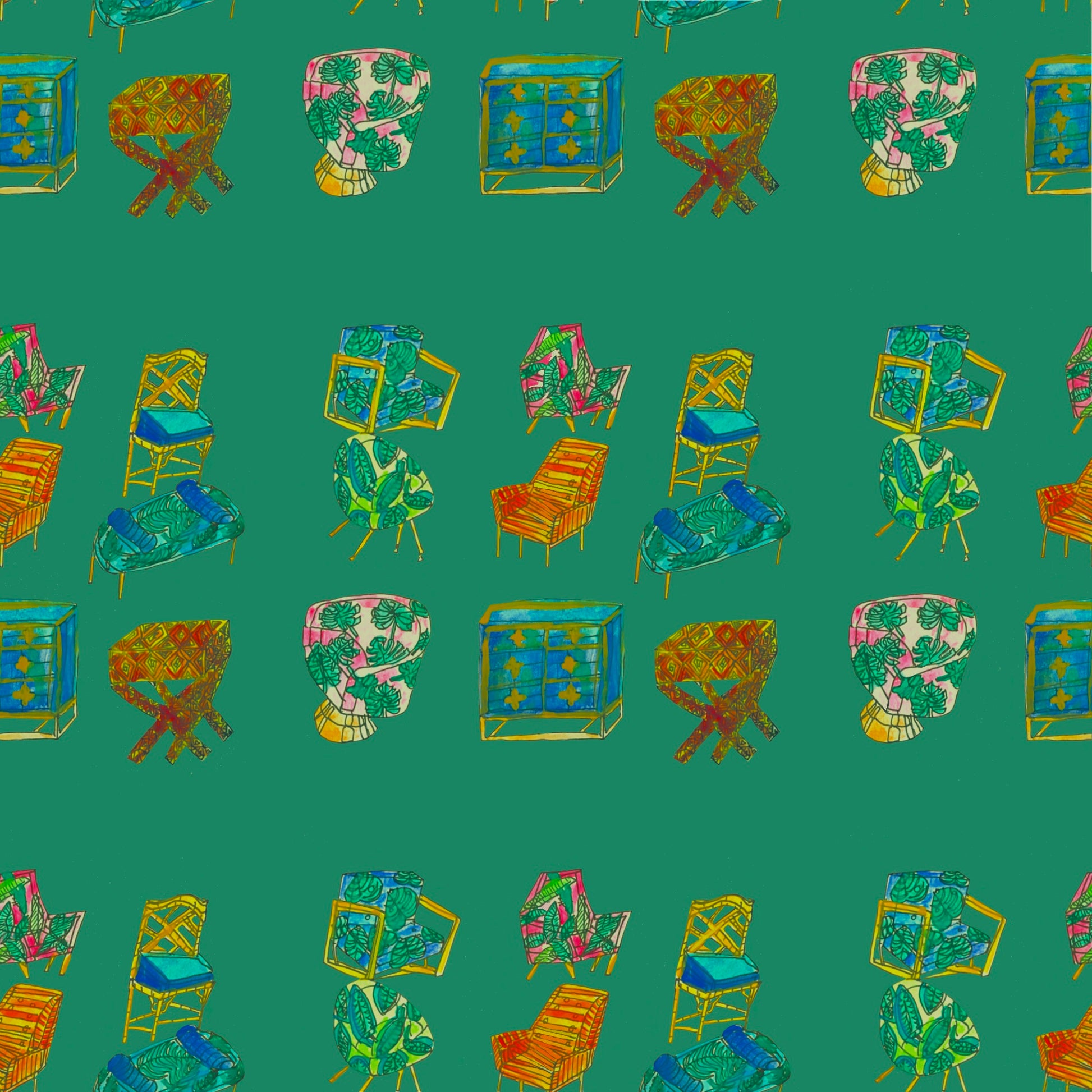 Hand-drawn artwork that celebrates the timeless allure of Mid-Century Modern (MCM) furniture, but with a contemporary and colorful twist.